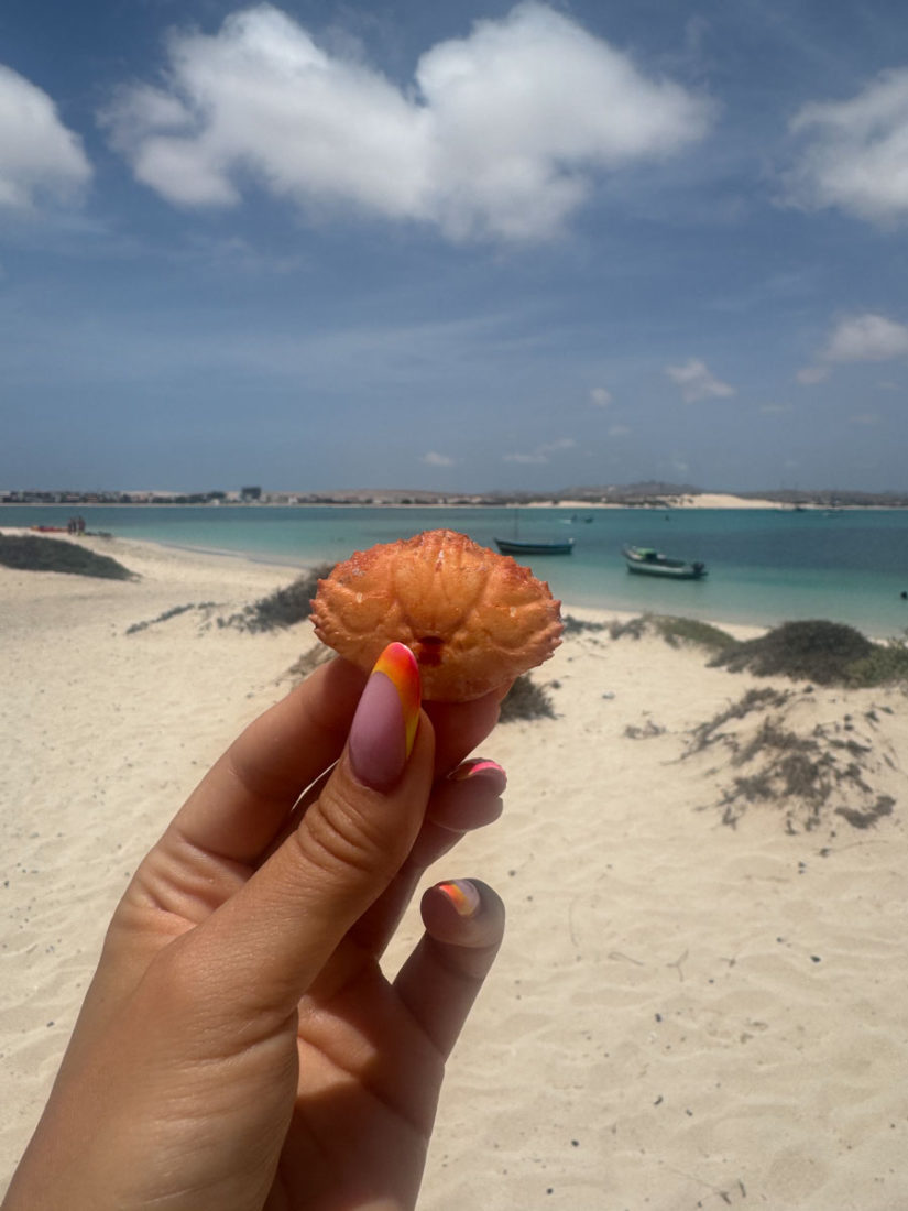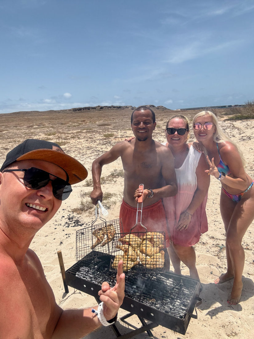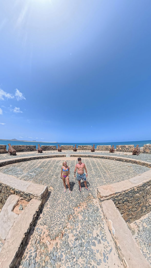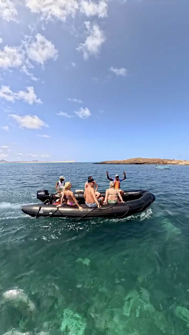 Przy niej następuję przerwa na kąpiel lub można jak my przesiąść się na ponton i przewożą Was na wyspę i tam zostajecie lub wracacie. My mieliśmy opcję z pozostaniem na niej do popołudnia, tam czekała na nas nasza druga organizatora Nathasja wraz z mężem. Na wyspie w programie jest totalny relaks, kąpiel i w cenie przekąski oraz grill na obiad. Przekąski to lokalne smaki jak sałatka z tuńczyka, krewetki, chlebek etc. – same pyszności. Grill przyrządza mąż Nathasji – są na nim złowione dziś przez niego ryby, kurczak, burgery, kiełbaski – wybór jest bardzo duży. Do tego oczywiście sałatki, chlebek, owoce. Dla każdego coś dobrego i wszystko pychota! W cenie macie również napoje alkoholowe i bezalkoholowe bez limitu, od whisky po wino, piwo, wódkę – a jak zabraknie to dowożą łódką, lecz zapas mają spory! Ważne jest to, że ten czas spędzacie w małym gronie, nas było 7 osób. Założeniem właśnie Boa Vista Carefy jest właśnie, aby każda wycieczka była w małej grupie, komfortowa, rodzinna i faktycznie udaje im się stworzyć ten klimat! Podczas tego czasu na wyspie są też różne zabawy dla chętnych, a także warto udać się na mały spacer na ruiny fortu – robie wrażenie. Powrót jest późnym popołudniem małą łódeczką do portu i busikiem do hotelu. Na do widzenia dostaliśmy wino z wysp Cabo Verde – dziękujemy!