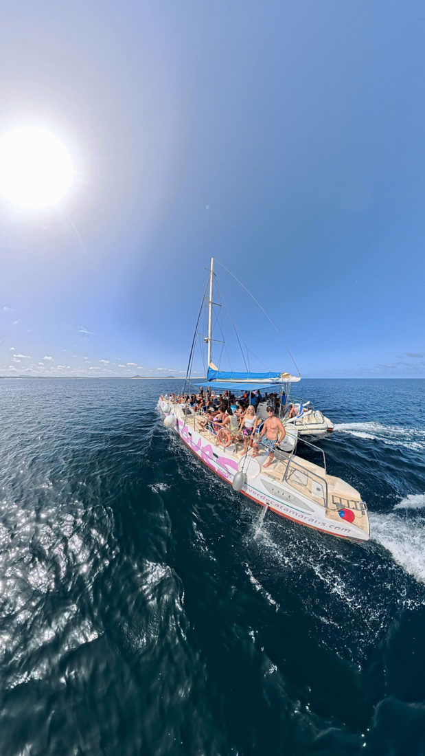Rozpoczęliśmy rano 8:30 przyjechał po nas busik, który zabrał nas do portu Sal Rei i tam wsiedliśmy na katamaran. Tutaj był miks ludzi z różnych wycieczek, muzyka i napoje bezalkoholowe plus piwo w cenie. Ten relaks z widokami trwał 1,5 godziny, podczas której opływaliśmy wybrzeże i małą bezludną wysepkę