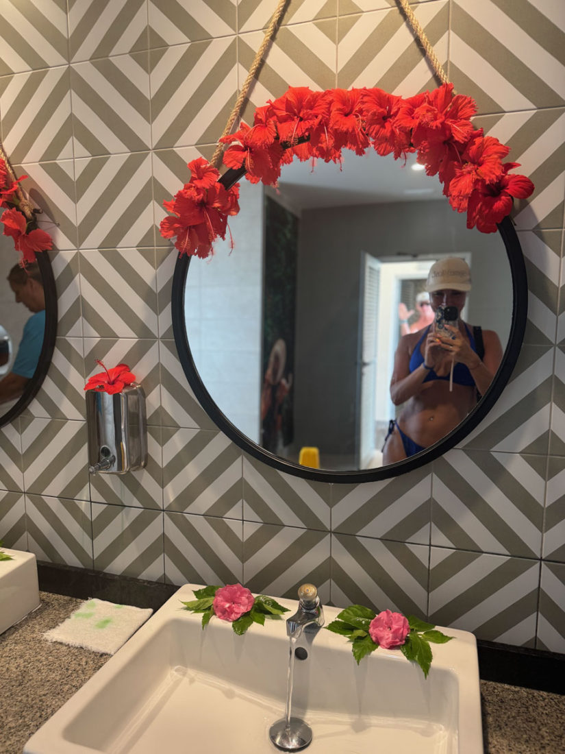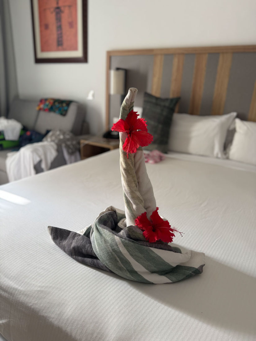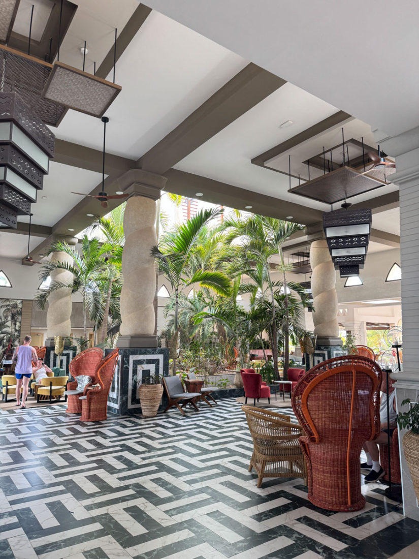 Ponownie wybraliśmy sieć Riu – niezawodny standard, tym razem padło na Riu Karamboa. Na wyspie macie 3 hotele z tej sieci oferowane przez TUI. Ten przykuł nasza uwagę ze względu na najlepsze położenie na wyspie, po tej bezpieczniejszej i jak mówią lokalni ładniejszej stronie. Pierwszy raz wylądowaliśmy w hotelu 18+ i powiem Wam, że był to strzał w 10! Spokój i cisza, zero wrzasków i płaczu, a do tego animacje dedykowane wyłączenie dorosłym przez cały dzień. Kupiliśmy pokój z widokiem na ocean i taki też bardzo polecamy. Dostaliśmy na najwyższym piętrze, a widoki były z niego cudne! W niektórych hotelach tej sieci macie alkohole w pokoju, tak było i w tym i klasycznie w łazience, butelki jak na barze z podajnikami i lodówka uzupełniana cały czas o Cole i inne klasyczne znane oryginalne napoje. Jest to taki bajer, bo mając all inclusive  raczej nie ma potrzeby picia drinków dodatkowo w pokoju.